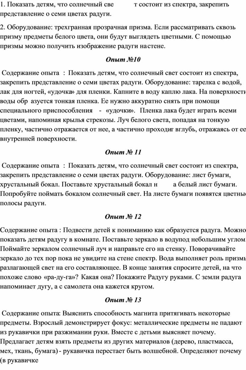 Содержание опыта : Подвести детей к пониманию как образуется радуга. Можно показать детям радугу в комнате. Поставьте зеркало в воду под небольшим углом. Поймайте зеркалом солнечный луч и направьте его на стенку. Поворачивайте зеркало до тех пор пока не увидите на стене спектр. Вода выполняет роль призмы разлагающей свет на его составляющее. В конце занятия спросите детей, на что похоже слово «ра-ду-га»? Какая она? Покажите Радугу руками. С земли радуга напоминает дугу, а с самолета она кажется кругом.
