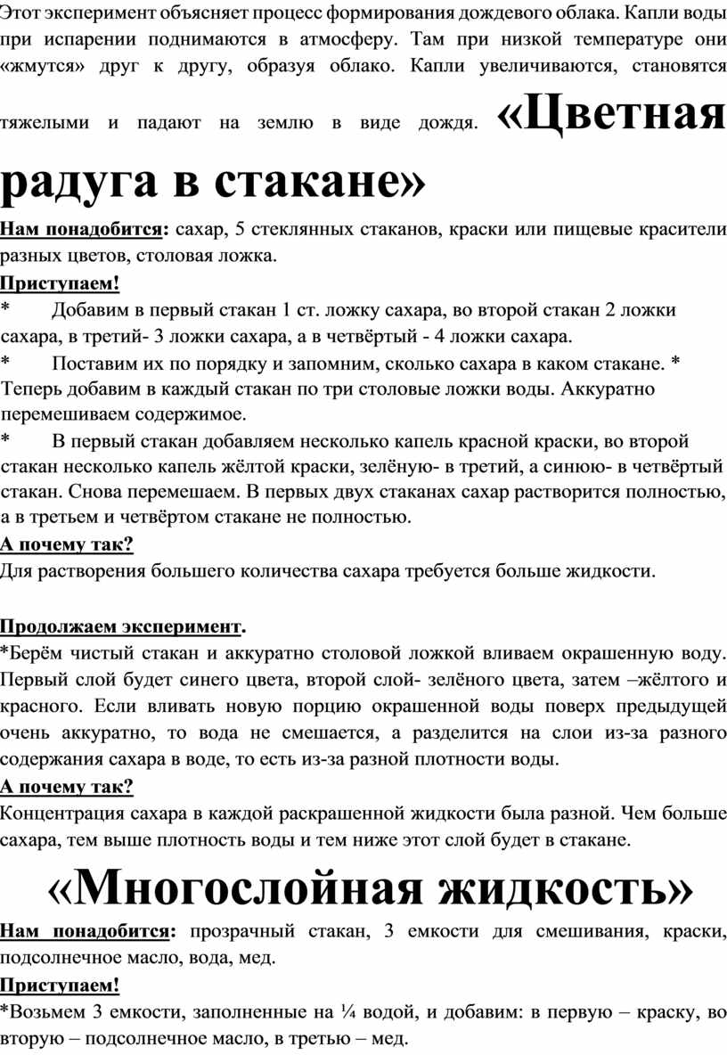 Этот эксперимент объясняет процесс формирования дождевого облака. Капли воды при испарении поднимаются в атмосферу. Там при низкой температуре они «жмутся» друг к другу, образуя облако. Капли увеличиваются, становятся тяжелыми и падают на землю в виде дождя. «Цветная радуга в стакане»