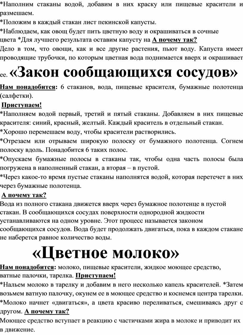 Дело в том, что овощи, как и все другие растения, пьют воду. Капуста имеет проводящие трубочки, по которым цветная вода поднимается вверх и окрашивает ее. «Закон сообщающихся сосудов»