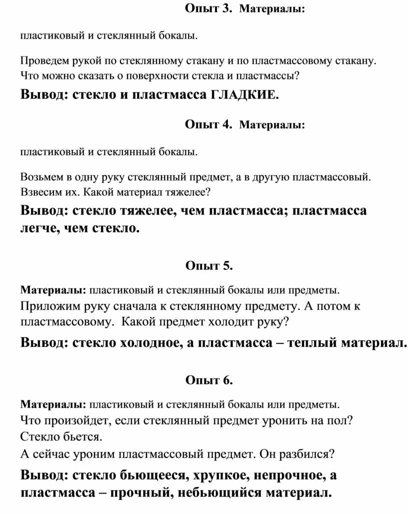 Вывод: стекло бьющееся, хрупкое, непрочное, а пластмасса – прочный, небьющийся материал.