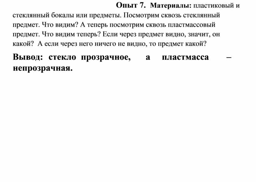Опыт 7. Материалы: пластиковый и стеклянный бокалы или предметы. Посмотрим сквозь стеклянный предмет. Что видим? А теперь посмотрим сквозь пластмассовый предмет. Что видим теперь? Если через предмет видно, значит, он какой? А если через него ничего не видно, то предмет какой?