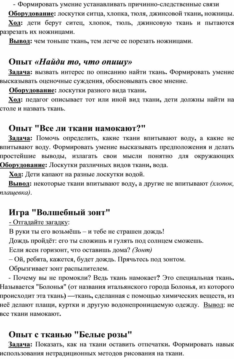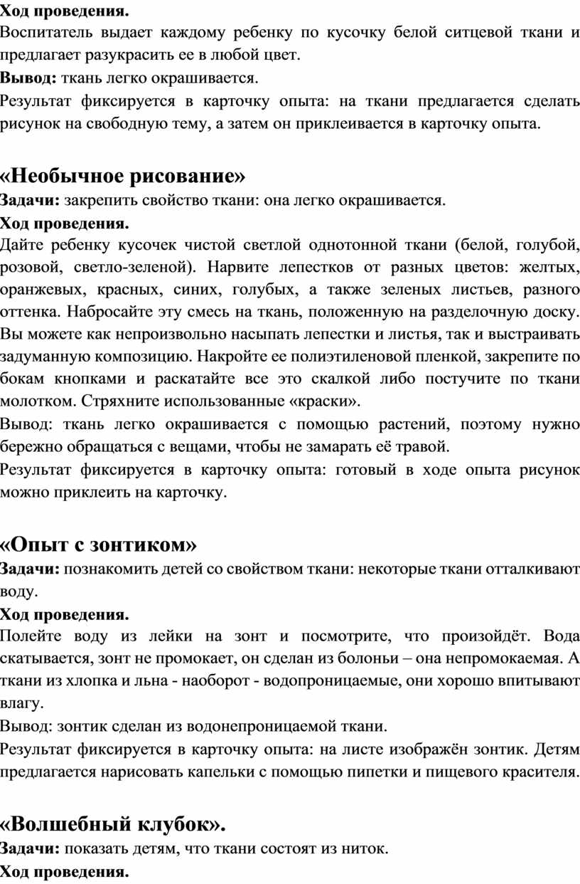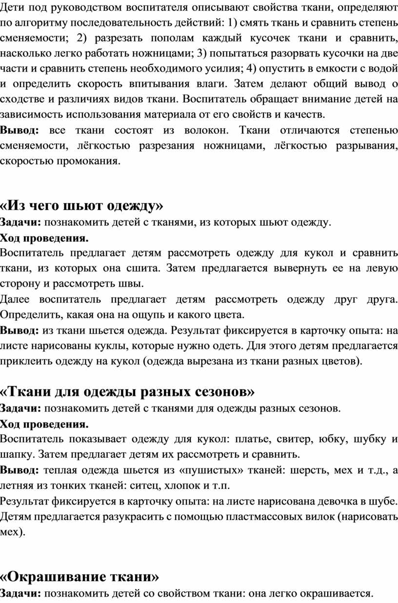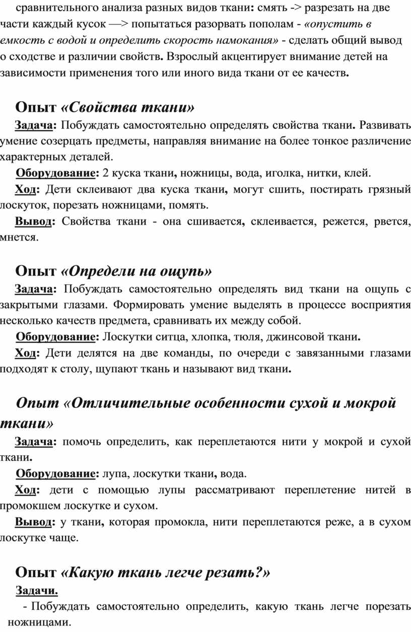 Описание. Дети рассматривают вещи, сшитые из разных видов тканей, обращают внимание на общую характеристику материала (мнется, рвется, режется, намокает, горит). Определяют алгоритм проведения сравнительного анализа разных видов ткани: смять -> разрезать на две части каждый кусок —> попытаться разорвать пополам - «опустить в емкость с водой и определить скорость намокания» - сделать общий вывод о сходстве и различии свойств. Взрослый акцентирует внимание детей на зависимости применения того или иного вида ткани от ее качеств.