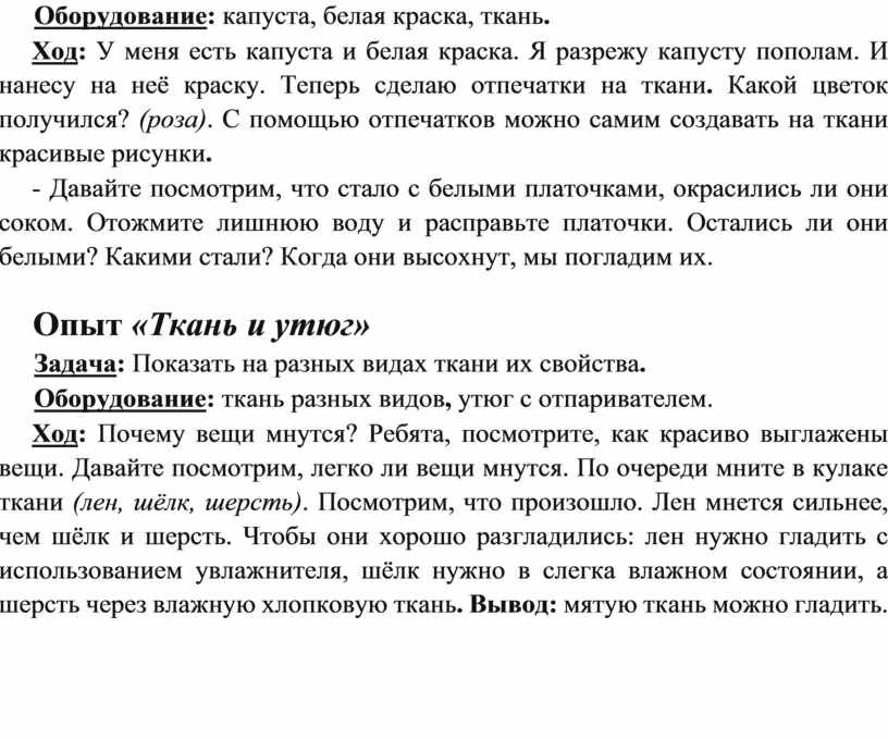 Ход: Почему вещи мнутся? Ребята, посмотрите, как красиво выглажены вещи. Давайте посмотрим, легко ли вещи мнутся. По очереди мните в кулаке ткани (лен, шёлк, шерсть). Посмотрим, что произошло. Лен мнется сильнее, чем шёлк и шерсть. Чтобы они хорошо разгладились: лен нужно гладить с использованием увлажнителя, шёлк нужно в слегка влажном состоянии, а шерсть через влажную хлопковую ткань. Вывод: мятую ткань можно гладить.