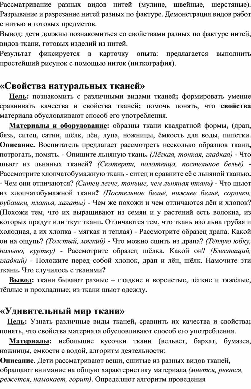 Вывод: дети должны познакомиться со свойствами разных по фактуре нитей, видов ткани, готовых изделий из нитей.