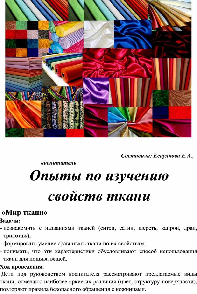 Цель: познакомить с различными видами тканей; формировать умение сравнивать качества и свойства тканей; помочь понять, что свойства материала обусловливают способ его употребления.
