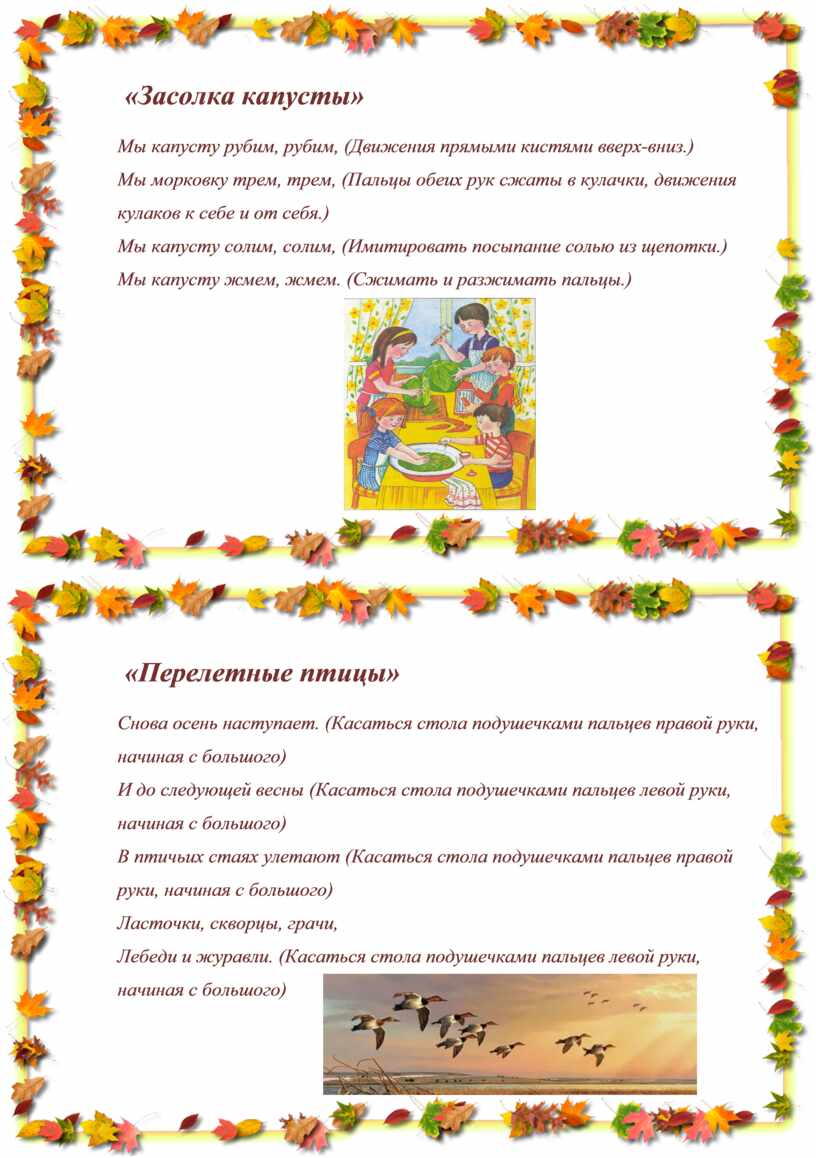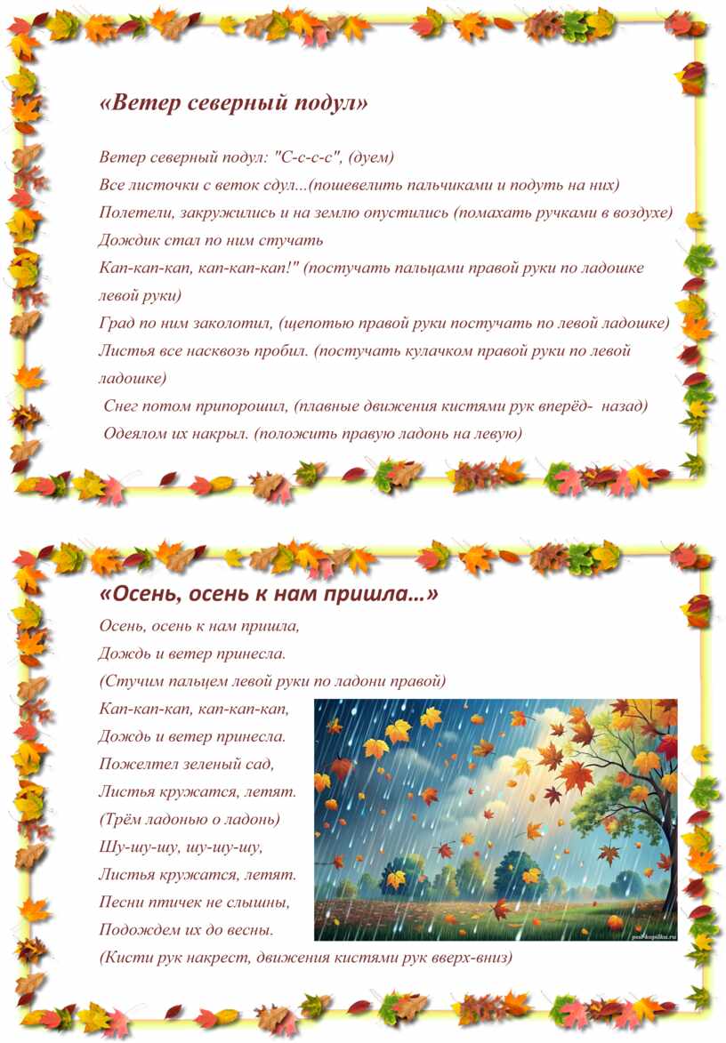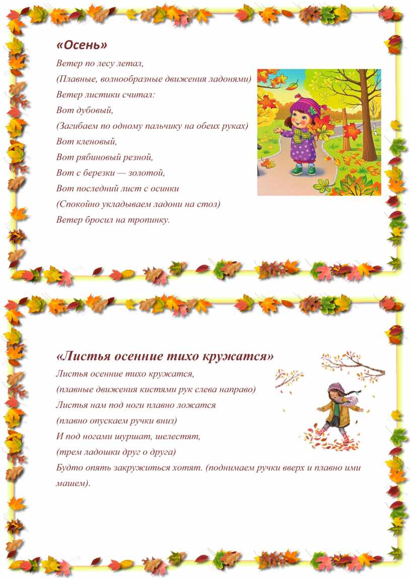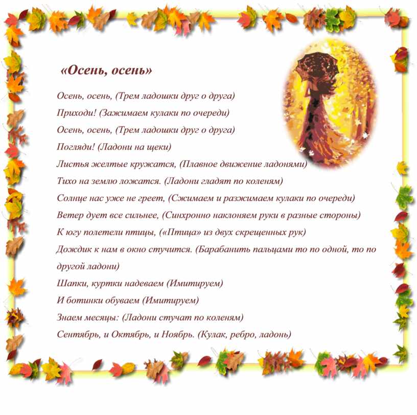 Осень, осень, (Трем ладошки друг о друга) Приходи! (Зажимаем кулаки по очереди) Осень, осень, (Трем ладошки друг о друга) Погляди! (Ладони на щеки) Листья желтые кружатся, (Плавное движение ладонями) Тихо на землю ложатся. (Ладони гладят по коленям) Солнце нас уже не греет, (Сжимаем и разжимаем кулаки по очереди) Ветер дует все сильнее, (Синхронно наклоняем руки в разные стороны) К югу полетели птицы, («Птица» из двух скрещенных рук) Дождик к нам в окно стучится. (Барабанить пальцами тo по одной, то по другой ладони) Шапки, куртки надеваем (Имитируем) И ботинки обуваем (Имитируем) Знаем месяцы: (Ладони стучат по коленям) Сентябрь, и Октябрь, и Ноябрь. (Кулак, ребро, ладонь)