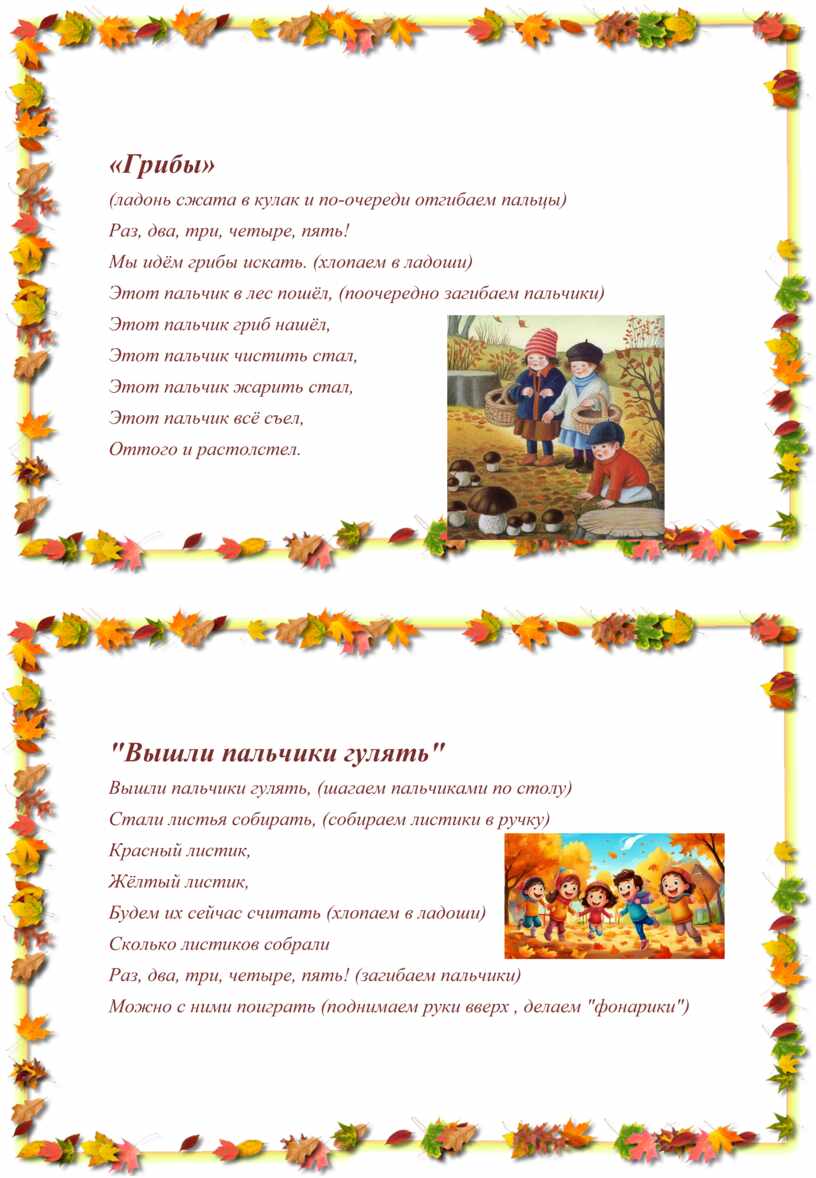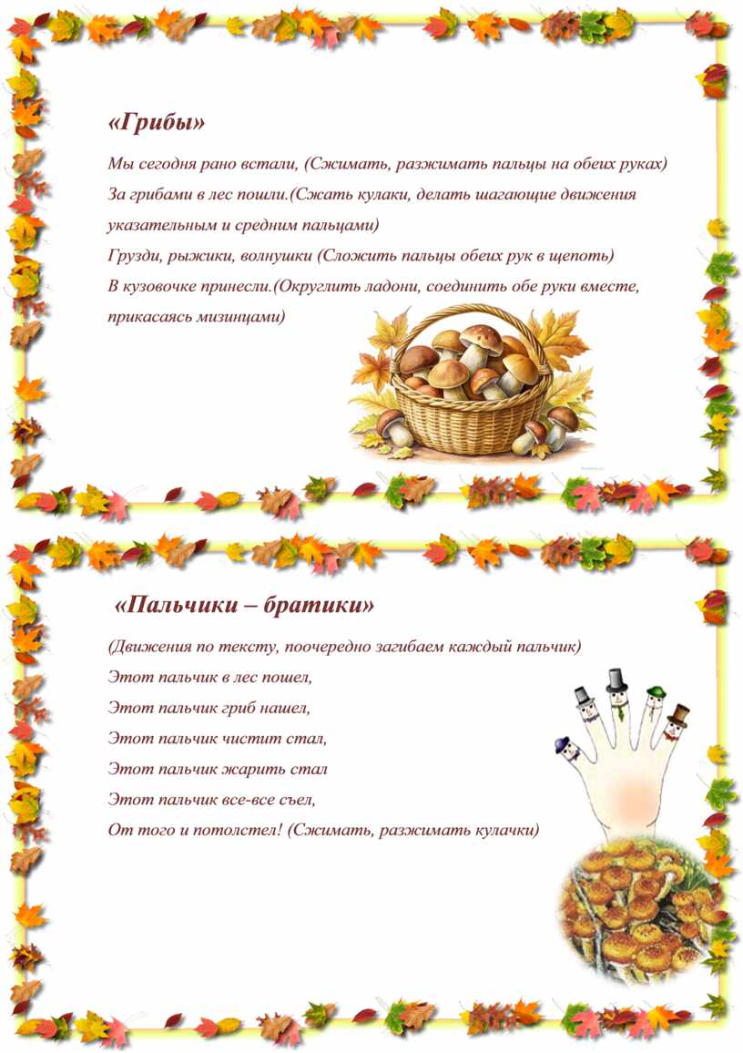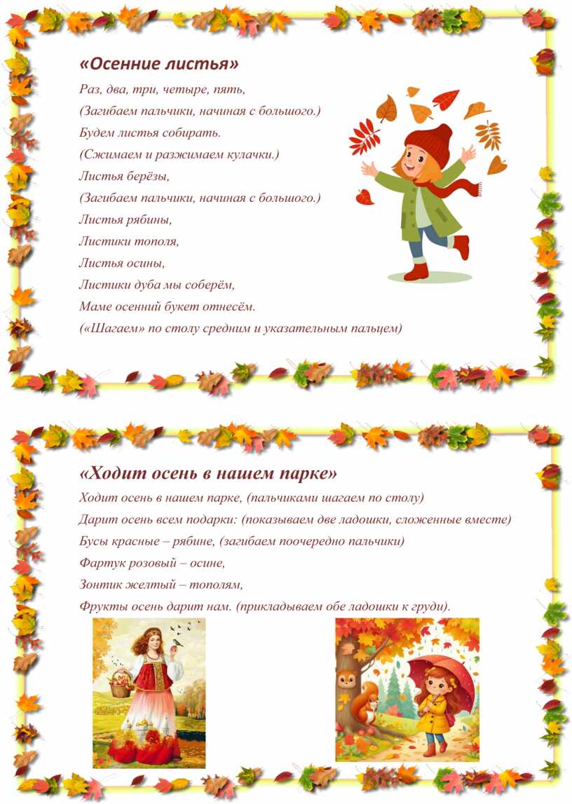 Осень, осень, (Трем ладошки друг о друга) Приходи! (Зажимаем кулаки по очереди) Осень, осень, (Трем ладошки друг о друга) Погляди! (Ладони на щеки) Листья желтые кружатся, (Плавное движение ладонями) Тихо на землю ложатся. (Ладони гладят по коленям) Солнце нас уже не греет, (Сжимаем и разжимаем кулаки по очереди) Ветер дует все сильнее, (Синхронно наклоняем руки в разные стороны) К югу полетели птицы, («Птица» из двух скрещенных рук) Дождик к нам в окно стучится. (Барабанить пальцами тo по одной, то по другой ладони) Шапки, куртки надеваем (Имитируем) И ботинки обуваем (Имитируем) Знаем месяцы: (Ладони стучат по коленям) Сентябрь, и Октябрь, и Ноябрь. (Кулак, ребро, ладонь)
