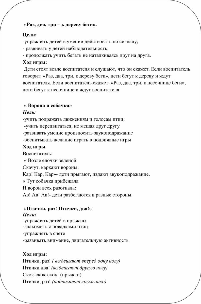 Дети стоят возле воспитателя и слушают, что он скажет. Если воспитатель говорит: «Раз, два, три, к дереву беги», дети бегут к дереву и ждут воспитателя. Если воспитатель скажет: «Раз, два, три, к песочнице беги», дети бегут к песочнице и ждут воспитателя.