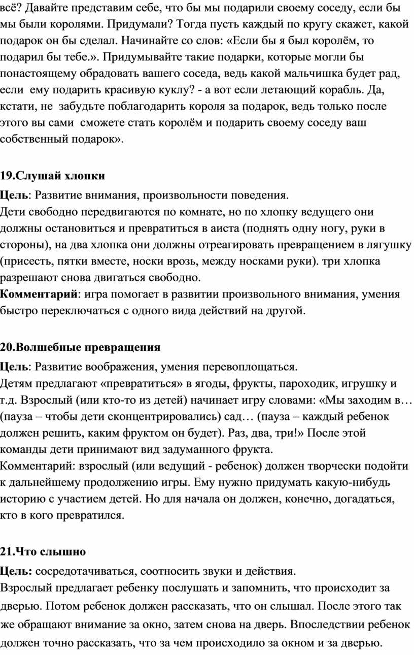 всё? Давайте представим себе, что бы мы подарили своему соседу, если бы мы были королями. Придумали? Тогда пусть каждый по кругу скажет, какой подарок он бы сделал. Начинайте со слов: «Если бы я был королём, то подарил бы тебе.». Придумывайте такие подарки, которые могли бы понастоящему обрадовать вашего соседа, ведь какой мальчишка будет рад, если ему подарить красивую куклу? - а вот если летающий корабль. Да, кстати, не забудьте поблагодарить короля за подарок, ведь только после этого вы сами сможете стать королём и подарить своему соседу ваш собственный подарок».