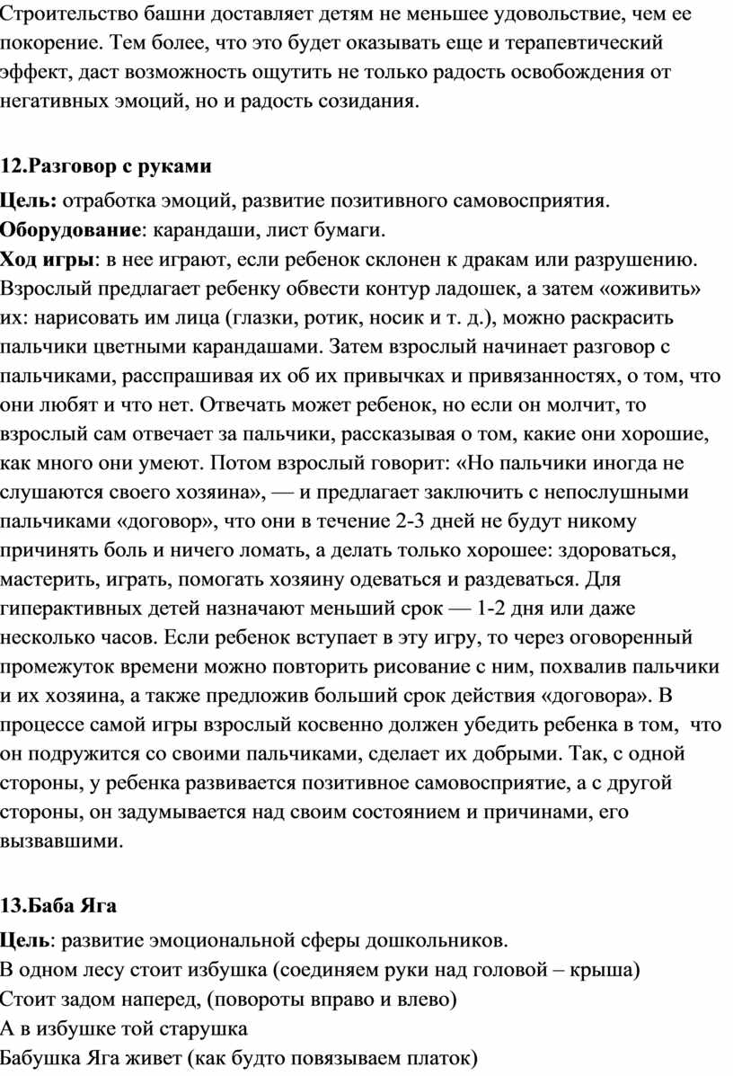 Ход игры: в нее играют, если ребенок склонен к дракам или разрушению. Взрослый предлагает ребенку обвести контур ладошек, а затем «оживить» их: нарисовать им лица (глазки, ротик, носик и т. д.), можно раскрасить пальчики цветными карандашами. Затем взрослый начинает разговор с пальчиками, расспрашивая их об их привычках и привязанностях, о том, что они любят и что нет. Отвечать может ребенок, но если он молчит, то взрослый сам отвечает за пальчики, рассказывая о том, какие они хорошие, как много они умеют. Потом взрослый говорит: «Но пальчики иногда не слушаются своего хозяина», — и предлагает заключить с непослушными пальчиками «договор», что они в течение 2-3 дней не будут никому причинять боль и ничего ломать, а делать только хорошее: здороваться, мастерить, играть, помогать хозяину одеваться и раздеваться. Для гиперактивных детей назначают меньший срок — 1-2 дня или даже несколько часов. Если ребенок вступает в эту игру, то через оговоренный промежуток времени можно повторить рисование с ним, похвалив пальчики и их хозяина, а также предложив больший срок действия «договора». В процессе самой игры взрослый косвенно должен убедить ребенка в том, что он подружится со своими пальчиками, сделает их добрыми. Так, с одной стороны, у ребенка развивается позитивное самовосприятие, а с другой стороны, он задумывается над своим состоянием и причинами, его вызвавшими.