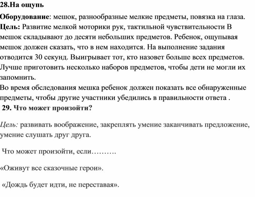 Оборудование: мешок, разнообразные мелкие предметы, повязка на глаза. Цель: Развитие мелкой моторики рук, тактильной чувствительности В мешок складывают до десяти небольших предметов. Ребенок, ощупывая мешок должен сказать, что в нем находится. На выполнение задания отводится 30 секунд. Выигрывает тот, кто назовет больше всех предметов. Лучше приготовить несколько наборов предметов, чтобы дети не могли их запомнить.