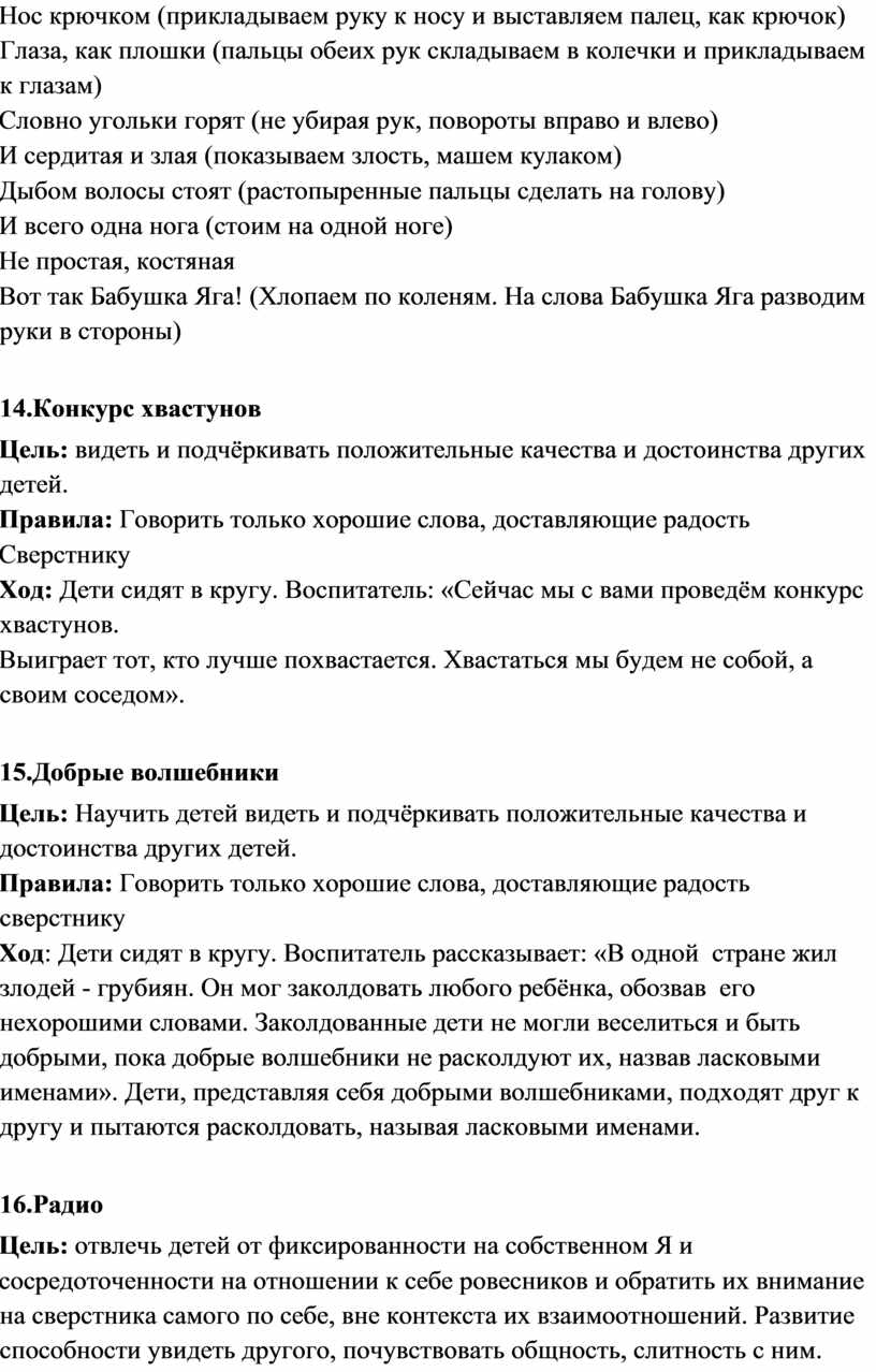 Ход: Дети сидят в кругу. Воспитатель рассказывает: «В одной стране жил злодей - грубиян. Он мог заколдовать любого ребёнка, обозвав его нехорошими словами. Заколдованные дети не могли веселиться и быть добрыми, пока добрые волшебники не расколдуют их, назвав ласковыми именами». Дети, представляя себя добрыми волшебниками, подходят друг к другу и пытаются расколдовать, называя ласковыми именами.