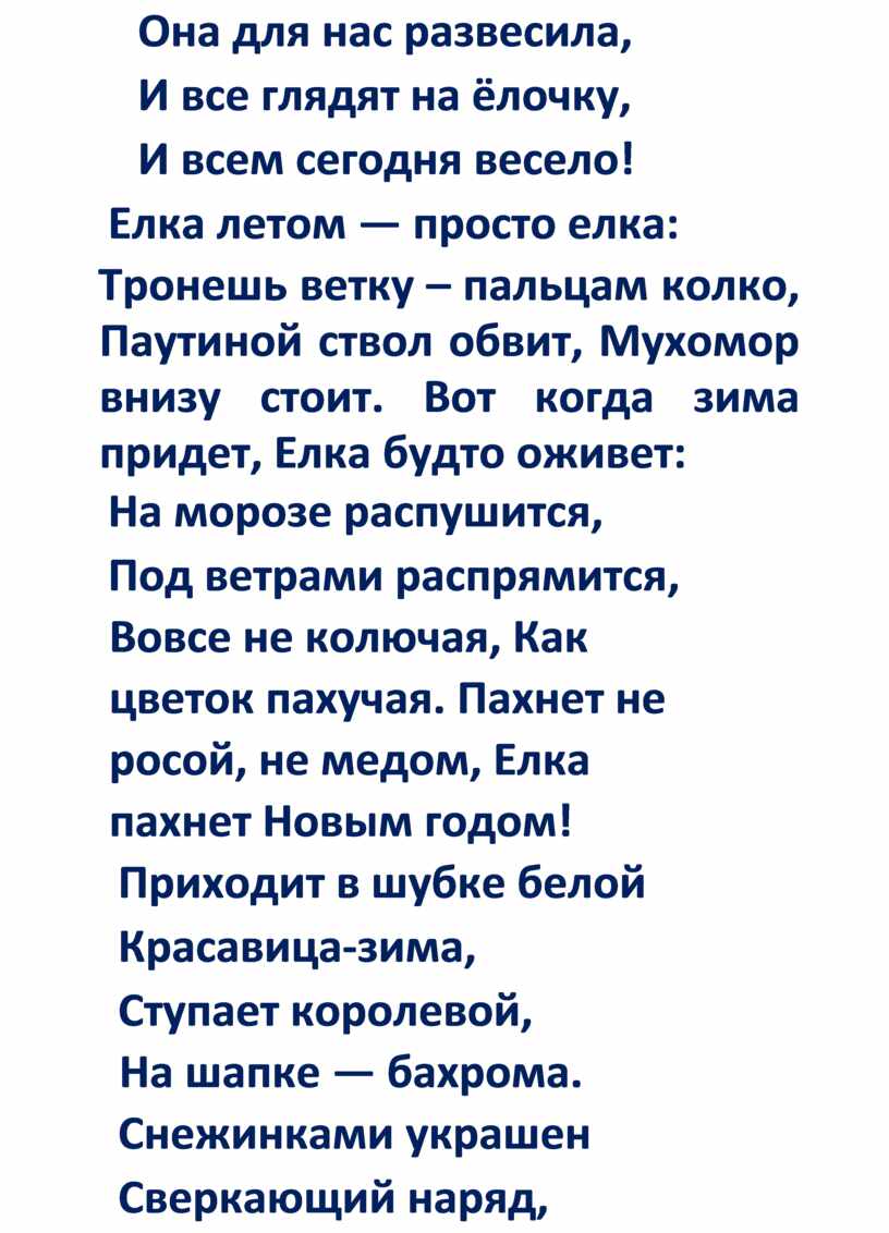 Тронешь ветку – пальцам колко, Паутиной ствол обвит, Мухомор внизу стоит. Вот когда зима придет, Елка будто оживет: