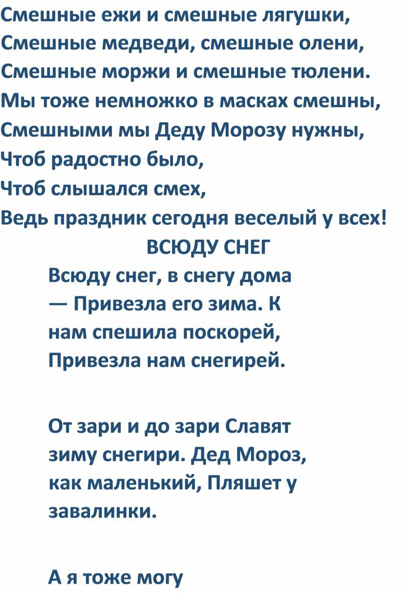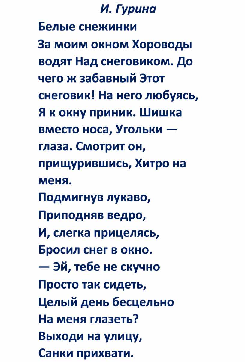 За моим окном Хороводы водят Над снеговиком. До чего ж забавный Этот снеговик! На него любуясь, Я к окну приник. Шишка вместо носа, Угольки — глаза. Смотрит он, прищурившись, Хитро на меня.