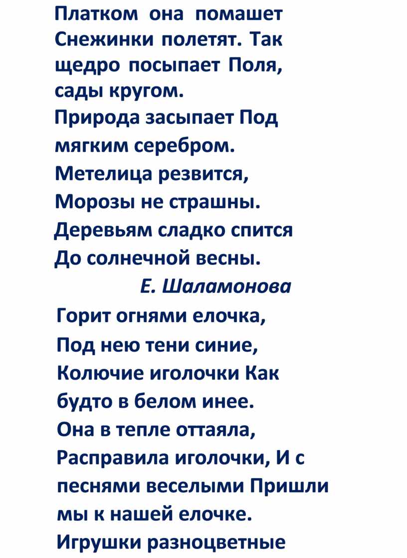 Природа засыпает Под мягким серебром. Метелица резвится, Морозы не страшны.