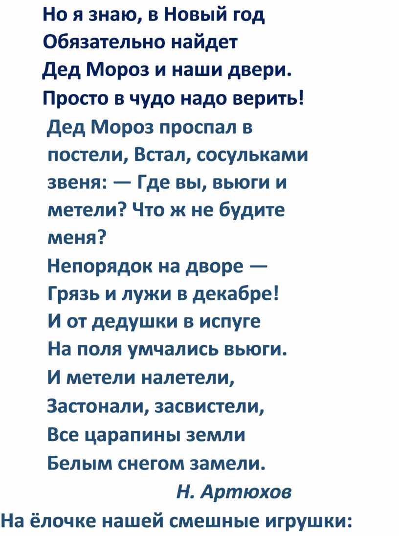 Дед Мороз проспал в постели, Встал, сосульками звеня: — Где вы, вьюги и метели? Что ж не будите меня?