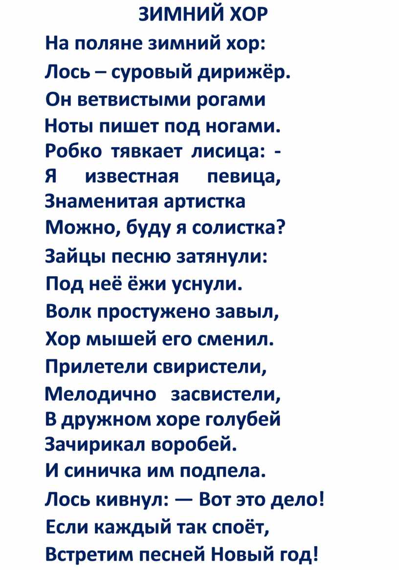 Зайцы песню затянули: Под неё ёжи уснули. Волк простужено завыл, Хор мышей его сменил.