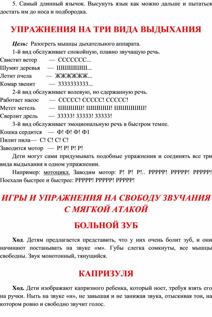 6) «главное слово» — дети произносят скороговорку по очереди, каждый раз выделяя новое слово, делая его главным по смыслу. Скороговорки можно разучивать в движении, в различных позах, с мячом или со скакалкой.