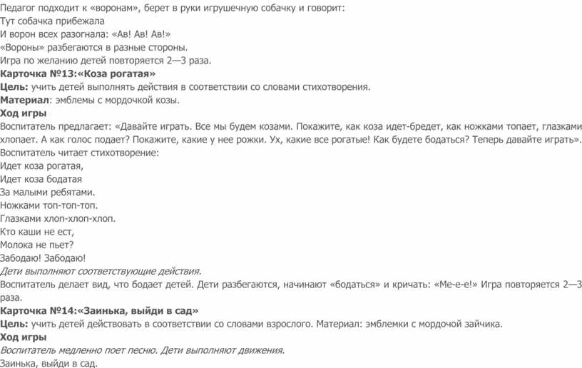 Воспитатель объясняет детям: «Мы все будем воробьями (раздает эмблемы птиц). Как летают воробьи? Как скачут? Как клюют? А как поют? Молодцы! Хорошие воробьи, веселые. А кто будет собачкой? (Ребенок-собачка берет мягкую игрушку, садится в уголок.) Кто вспомнит, как домик собачки называется? Правильно, будка! Наша собачка сидит в будке. Начинаем играть».