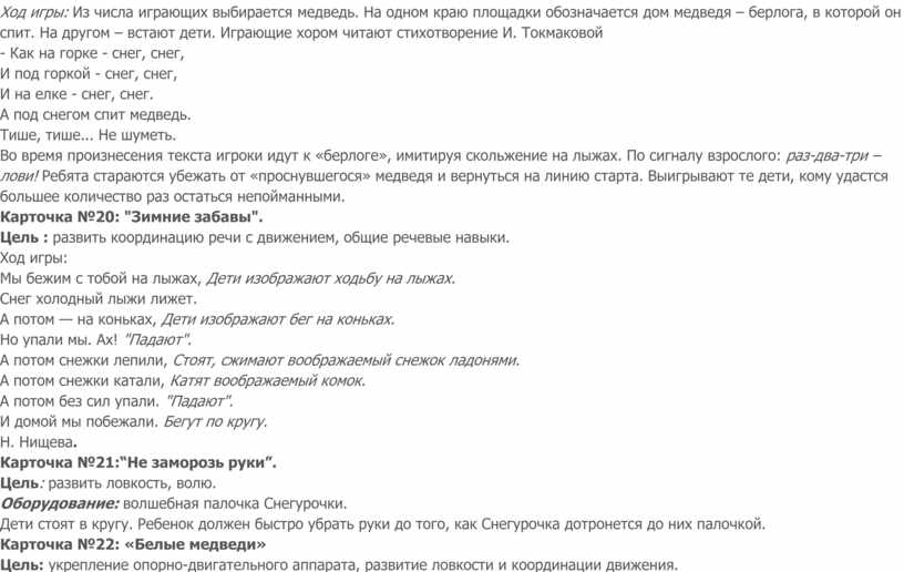 Ход игры: Из числа играющих выбирается медведь. На одном краю площадки обозначается дом медведя – берлога, в которой он спит. На другом – встают дети. Играющие хором читают стихотворение И. Токмаковой