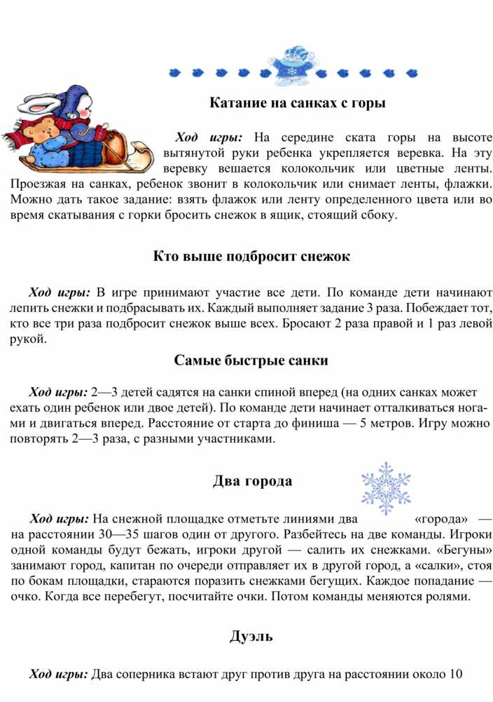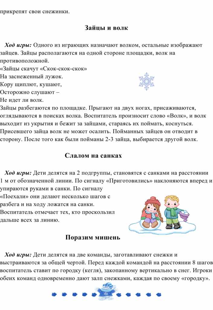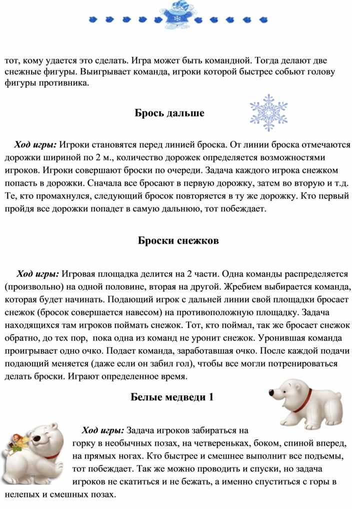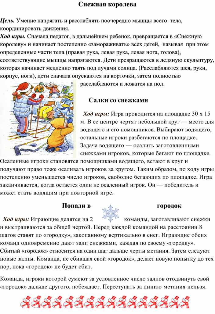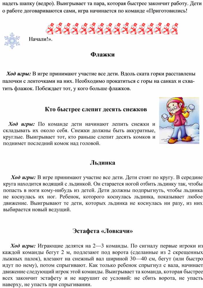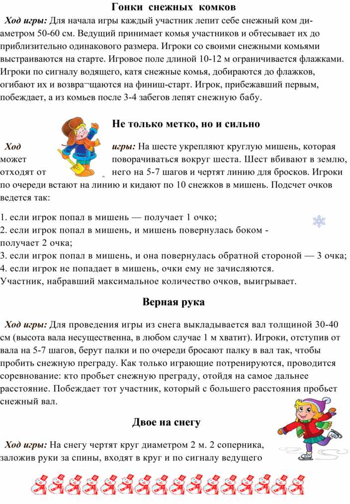 Ход игры: По команде дети начинают лепить снежки и складывать их около себя. Снежки должны быть аккуратные, круглые. Выигрывает тот, кто раньше слепит десять комков и поднимет последний комок над головой.