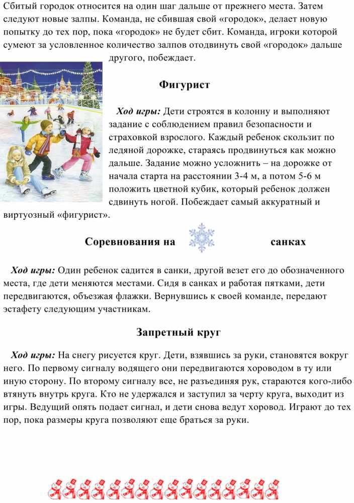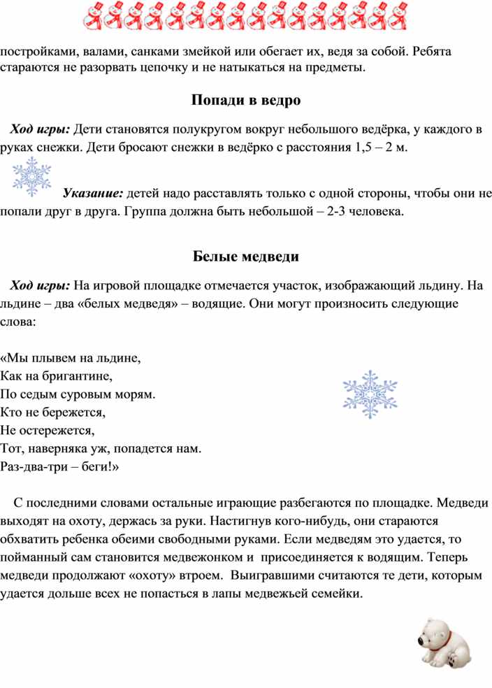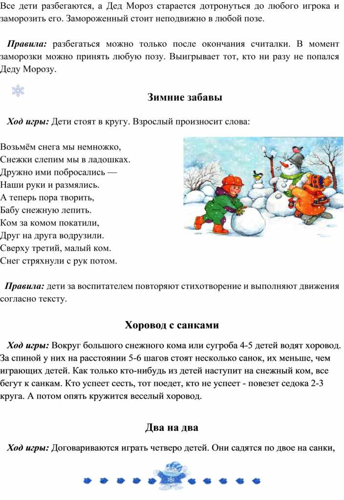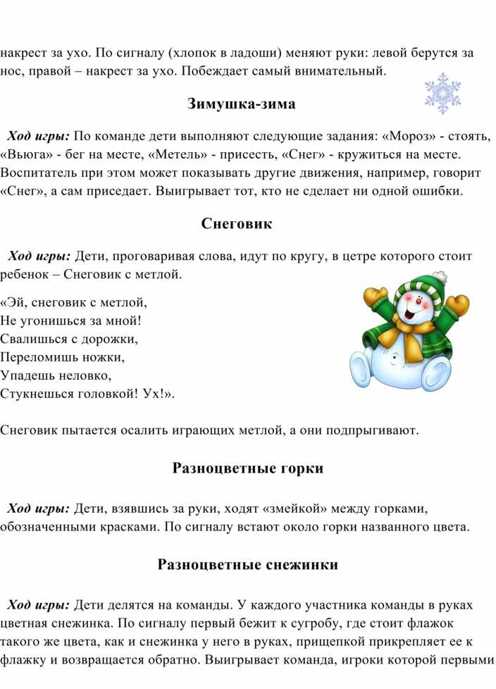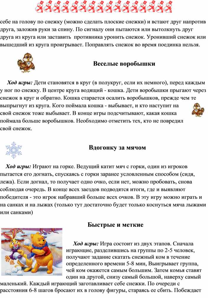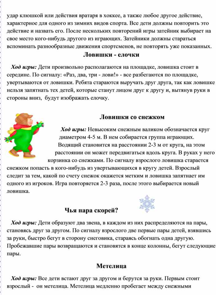 Ход игры: По команде дети начинают лепить снежки и складывать их около себя. Снежки должны быть аккуратные, круглые. Выигрывает тот, кто раньше слепит десять комков и поднимет последний комок над головой.