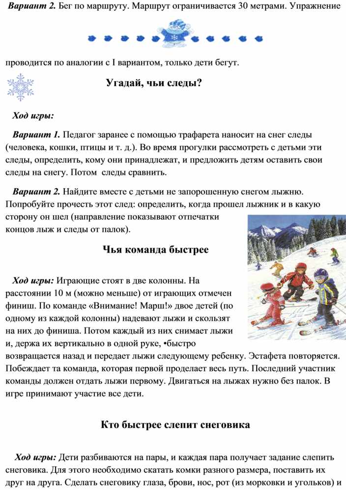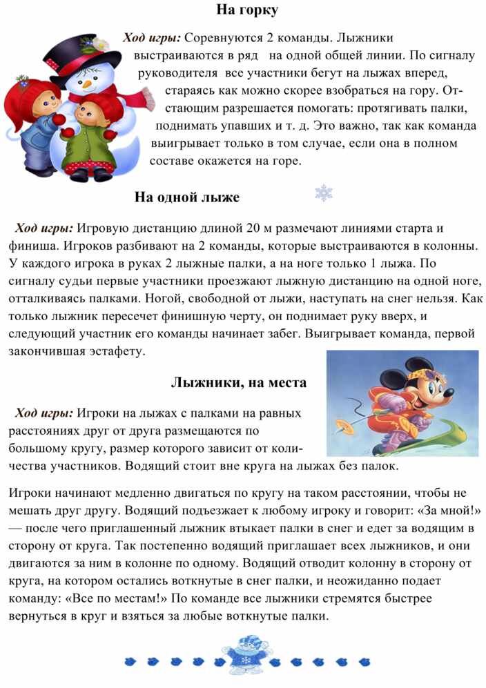 Ход игры: Играющие стоят в две колонны. На расстоянии 10 м (можно меньше) от играющих отмечен финиш. По команде «Внимание! Марш!» двое детей (по одному из каждой колонны) надевают лыжи и скользят на них до финиша. Потом каждый из них снимает лыжи и, держа их вертикально в одной руке, •быстро возвращается назад и передает лыжи следующему ребенку. Эстафета повторяется. Побеждает та команда, которая первой проделает весь путь. Последний участник команды должен отдать лыжи первому. Двигаться на лыжах нужно без палок. В игре принимают участие все дети.