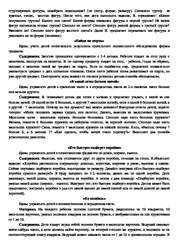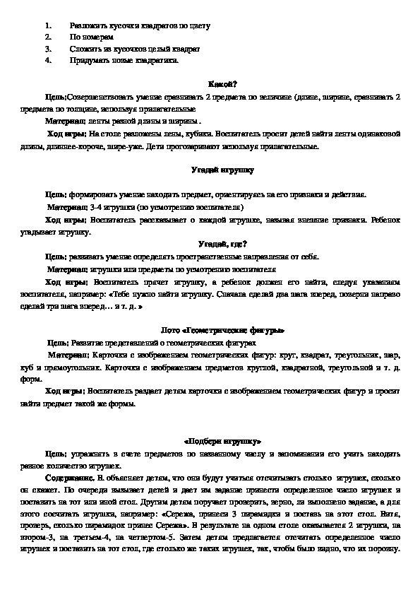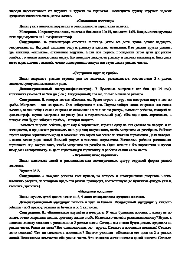 Цель: закрепить умение быстро находить геометрическую фигуру определённого размера и цвета.