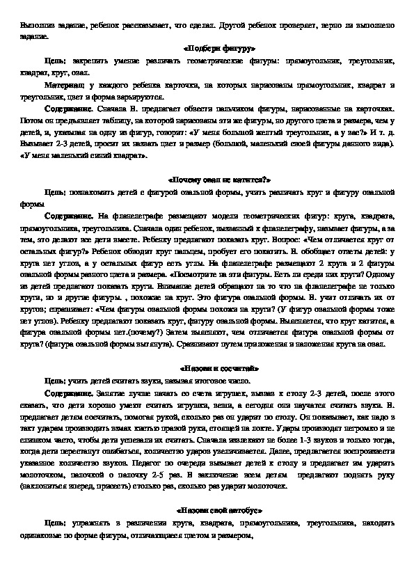 детей, и, указывая на одну из фигур, говорит: «У меня большой желтый треугольник, а у вас?» И т. д.