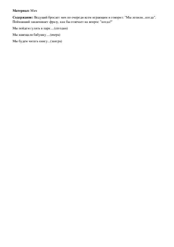 Содержание: Ведущий бросает мяч по очереди всем играющим и говорит: "Мы лепили...когда".