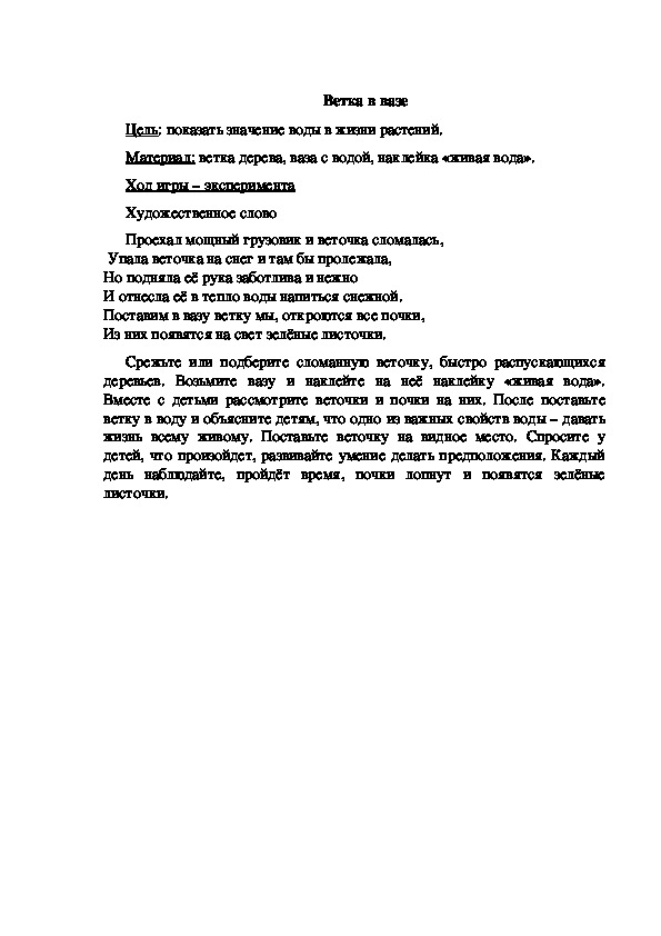 ветку в воду и объясните детям, что одно из важных свойств воды – давать
