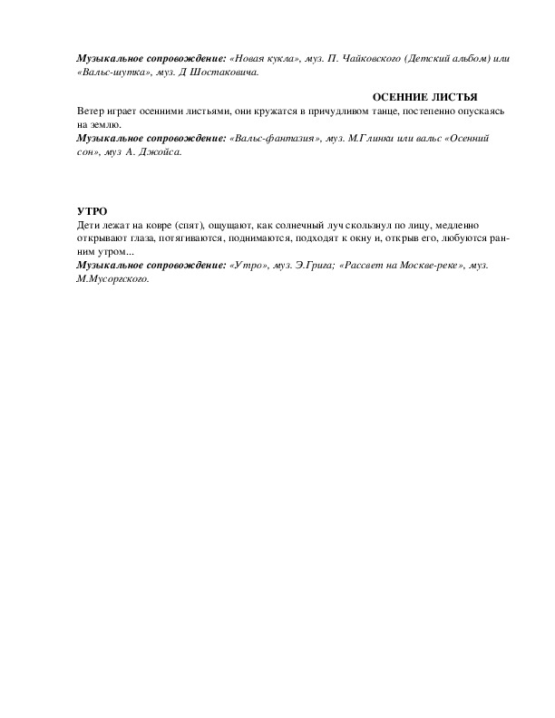 Музыкальное сопровождение: «Утро», муз. Э.Грига; «Рассвет на Москвереке», муз.