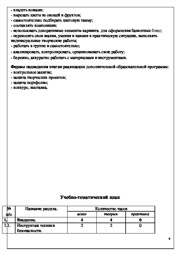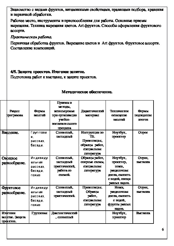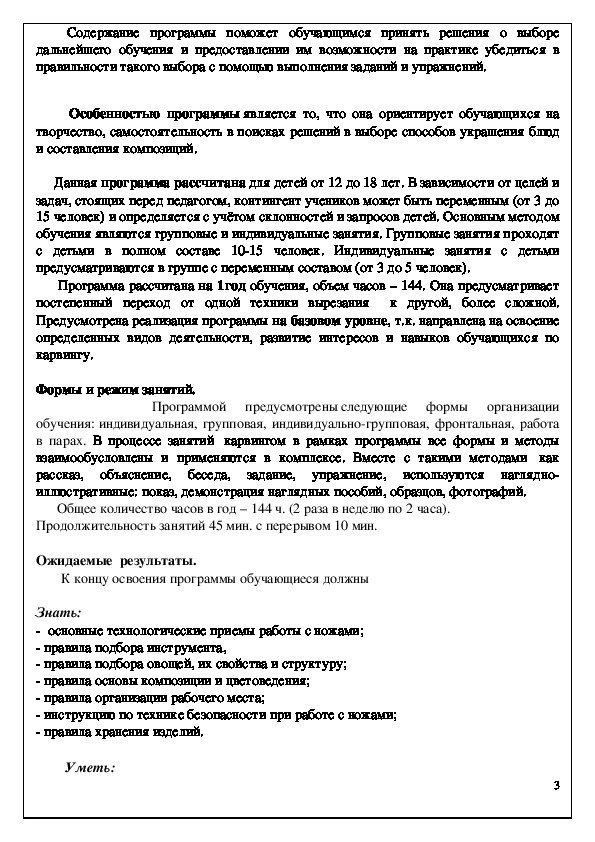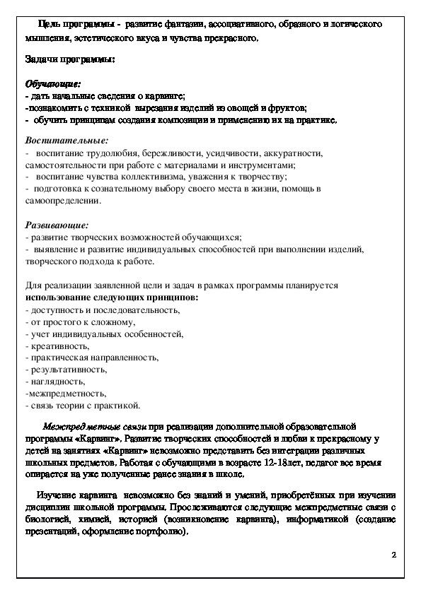 Программа "Карвинг" вводит ребенка в удивительный мир съедобного творчества. С помощью различных техник резьбы: карбования, насечения, каннелирования и гравирования, дети могут вырезать различные 3д композиции. Программа предусматривает развитие у обучающихся изобразительных, художественно-конструкторских способностей, нестандартного мышления, творческой индивидуальности. Во всем многообразном мире нет ничего более доброго, замечательного и увлекательного, чем вдохновенное кулинарное творчество, особенно, при воодушевляющем и направляющем участии детей. Это искусство в наши дни притягивает и любителей и профессионалов. Мода на восточную кухню только подогрела интерес европейцев к этому мастерству и уже давно кулинарные выставки, торжественные церемонии и вечеринки не обходятся без украшения их резными композициями.