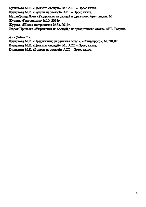 7Кузнецова М.Е. «Цветы из овощей», М.: АСТ – Пресс книга.
