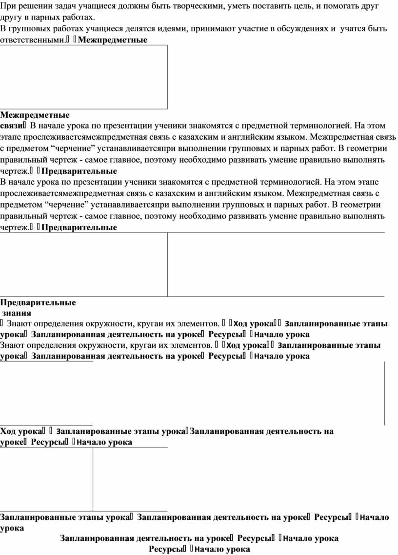 В начале урока по презентации ученики знакомятся с предметной терминологией. На этом этапе прослеживаетсямежпредметная связь с казахским и английским языком. Межпредметная связь с предметом “черчение” устанавливаетсяпри выполнении групповых и парных работ. В геометрии правильный чертеж - самое главное, поэтому необходимо развивать умение правильно выполнять чертеж. |