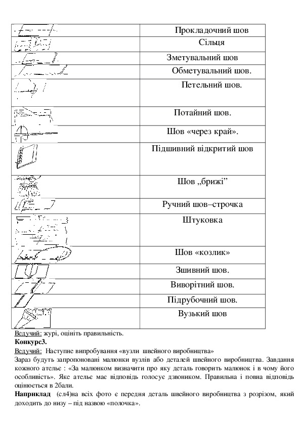 Зараз будуть запропоновані малюнки вузлів або деталей швейного виробництва. Завдання