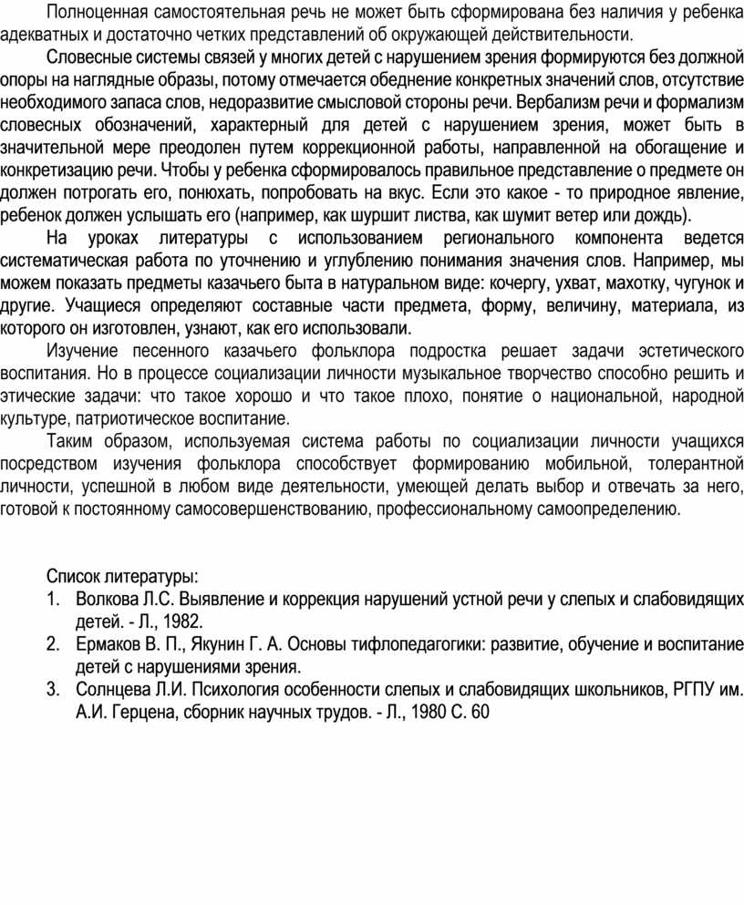 3. Солнцева Л.И. Психология особенности слепых и слабовидящих школьников, РГПУ им. А.И. Герцена, сборник научных трудов. - Л., 1980 С. 60