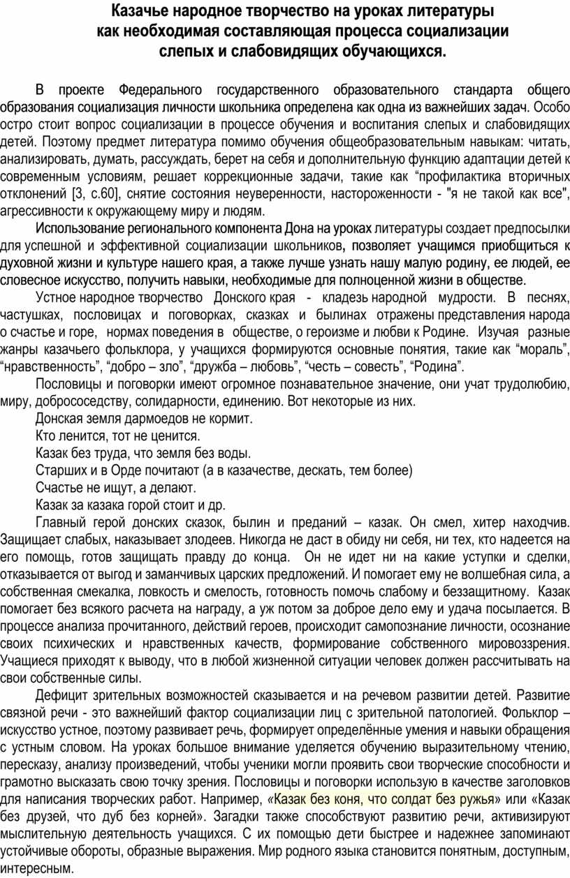 Дефицит зрительных возможностей сказывается и на речевом развитии детей. Развитие связной речи - это важнейший фактор социализации лиц с зрительной патологией. Фольклор – искусство устное, поэтому развивает речь, формирует определённые умения и навыки обращения с устным словом. На уроках большое внимание уделяется обучению выразительному чтению, пересказу, анализу произведений, чтобы ученики могли проявить свои творческие способности и грамотно высказать свою точку зрения. Пословицы и поговорки использую в качестве заголовков для написания творческих работ. Например, «Казак без коня, что солдат без ружья» или «Казак без друзей, что дуб без корней». Загадки также способствуют развитию речи, активизируют мыслительную деятельность учащихся. С их помощью дети быстрее и надежнее запоминают устойчивые обороты, образные выражения. Мир родного языка становится понятным, доступным, интересным.
