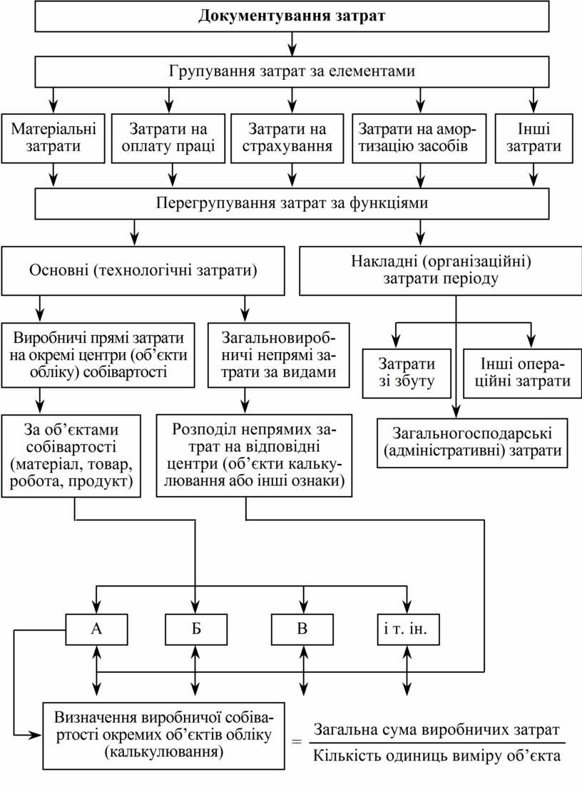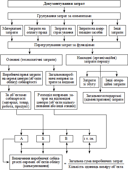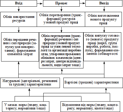 Для правильної побудови бухгалтерського обліку затрат виробництва та випуску, калькулювання собівартості продукції облік слід будувати на кібернетичній основі як «вхід — процес — вихід». Такий трьохаспектний підхід відповідає тим трьом аспектам процесу виробничої діяльності.