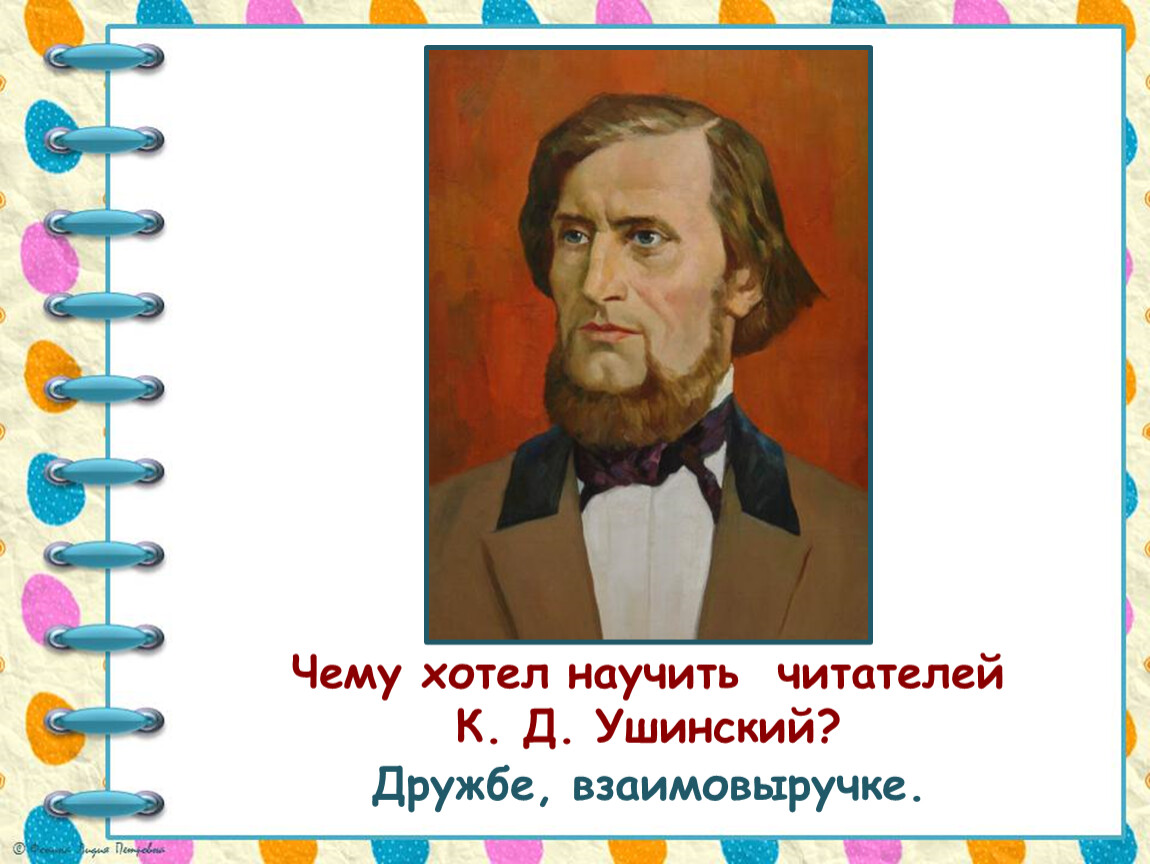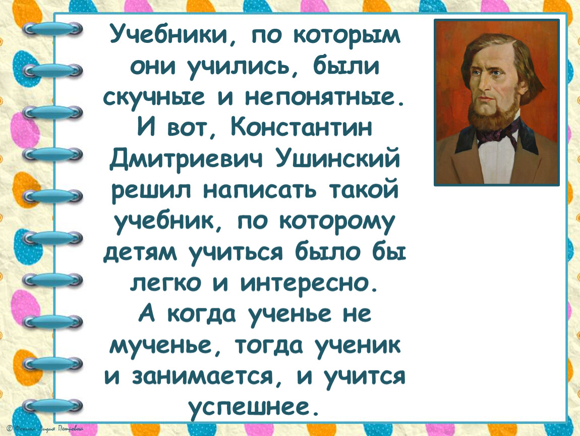 И вот, Константин Дмитриевич Ушинский решил написать такой учебник, по которому детям учиться было бы легко и интересно.