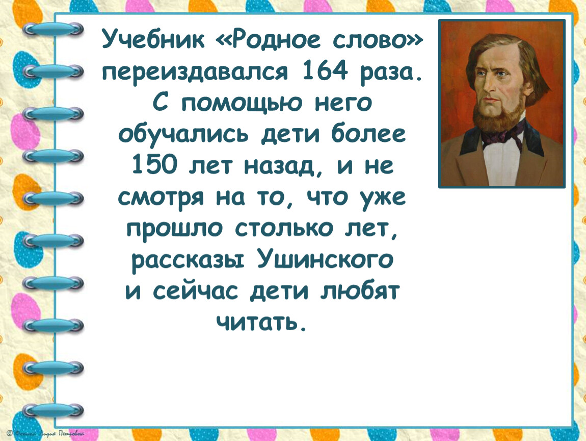Учебник «Родное слово» переиздавался 164 раза. С помощью него обучались дети более 150 лет назад, и не смотря на то, что уже прошло столько лет, рассказы Ушинского