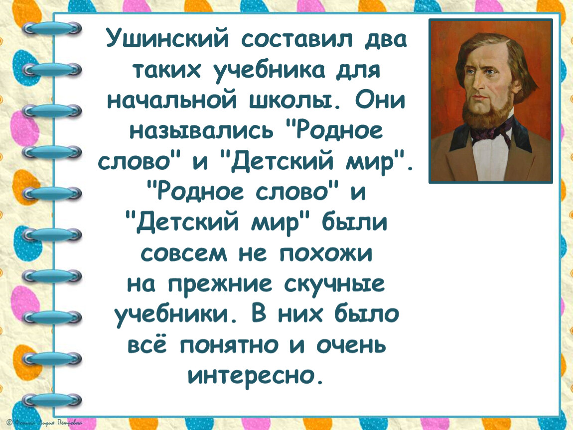 Ушинский составил два таких учебника для начальной школы. Они назывались "Родное слово" и "Детский мир".