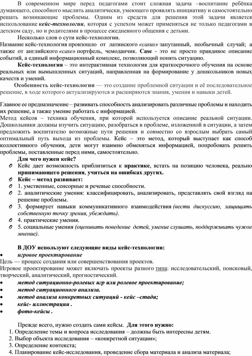 В современном мире перед педагогами стоит сложная задача –воспитание ребёнка думающего, способного мыслить аналитически, умеющего проявлять инициативу и самостоятельно решать возникающие проблемы. Одним из средств для решения этой задачи является использование кейс-технологии, которая с успехом может применяться не только педагогами в детском саду, но и родителями в процессе ежедневного общения с детьми.