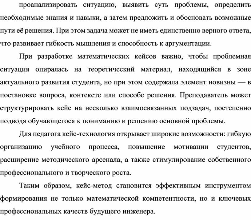 Таким образом, кейс-метод становится эффективным инструментом формирования не только математической компетентности, но и ключевых профессиональных качеств будущего инженера.
