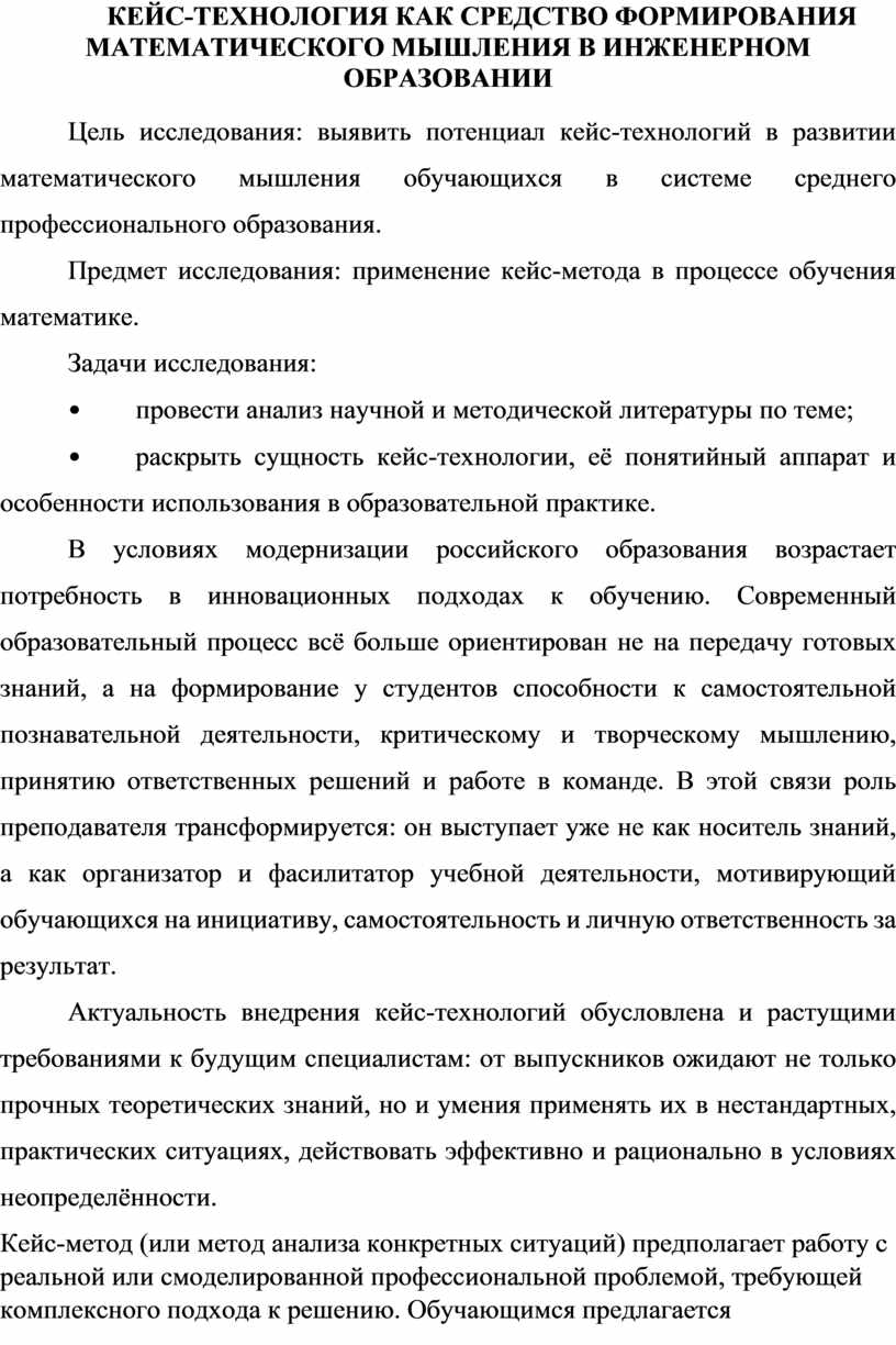 Цель исследования: выявить потенциал кейс-технологий в развитии математического мышления обучающихся в системе среднего профессионального образования.