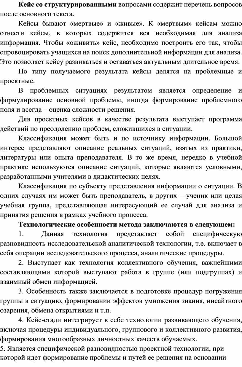 5. Является специфической разновидностью проектной технологии, при которой идет формирование проблемы и путей ее решения на основании кейса, который выступает одновременно в виде технического задания и источника информации для осознания вариантов эффективных действий.