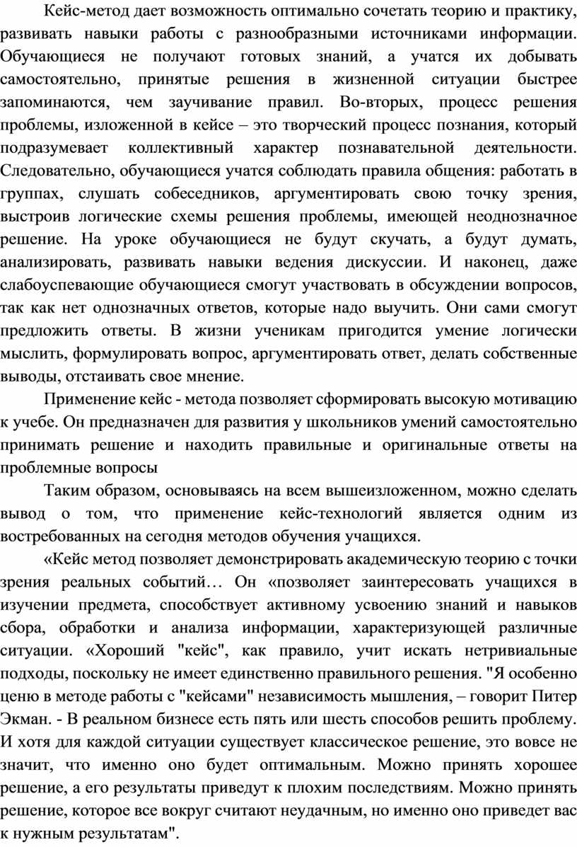 «Кейс метод позволяет демонстрировать академическую теорию с точки зрения реальных событий… Он «позволяет заинтересовать учащихся в изучении предмета, способствует активному усвоению знаний и навыков сбора, обработки и анализа информации, характеризующей различные ситуации. «Хороший "кейс", как правило, учит искать нетривиальные подходы, поскольку не имеет единственно правильного решения. "Я особенно ценю в методе работы с "кейсами" независимость мышления, – говорит Питер Экман. - В реальном бизнесе есть пять или шесть способов решить проблему. И хотя для каждой ситуации существует классическое решение, это вовсе не значит, что именно оно будет оптимальным. Можно принять хорошее решение, а его результаты приведут к плохим последствиям. Можно принять решение, которое все вокруг считают неудачным, но именно оно приведет вас к нужным результатам".