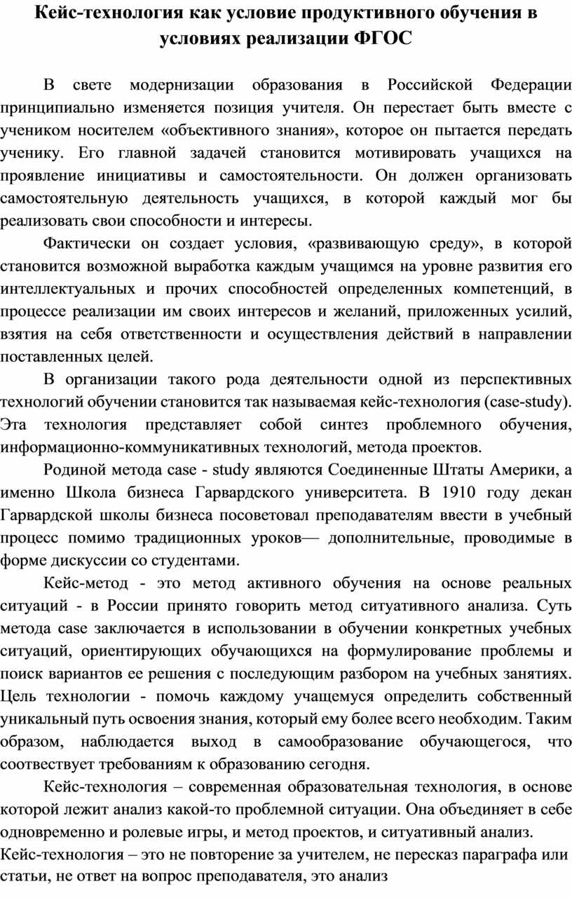 Кейс-технология как условие продуктивного обучения в условиях реализации ФГОС