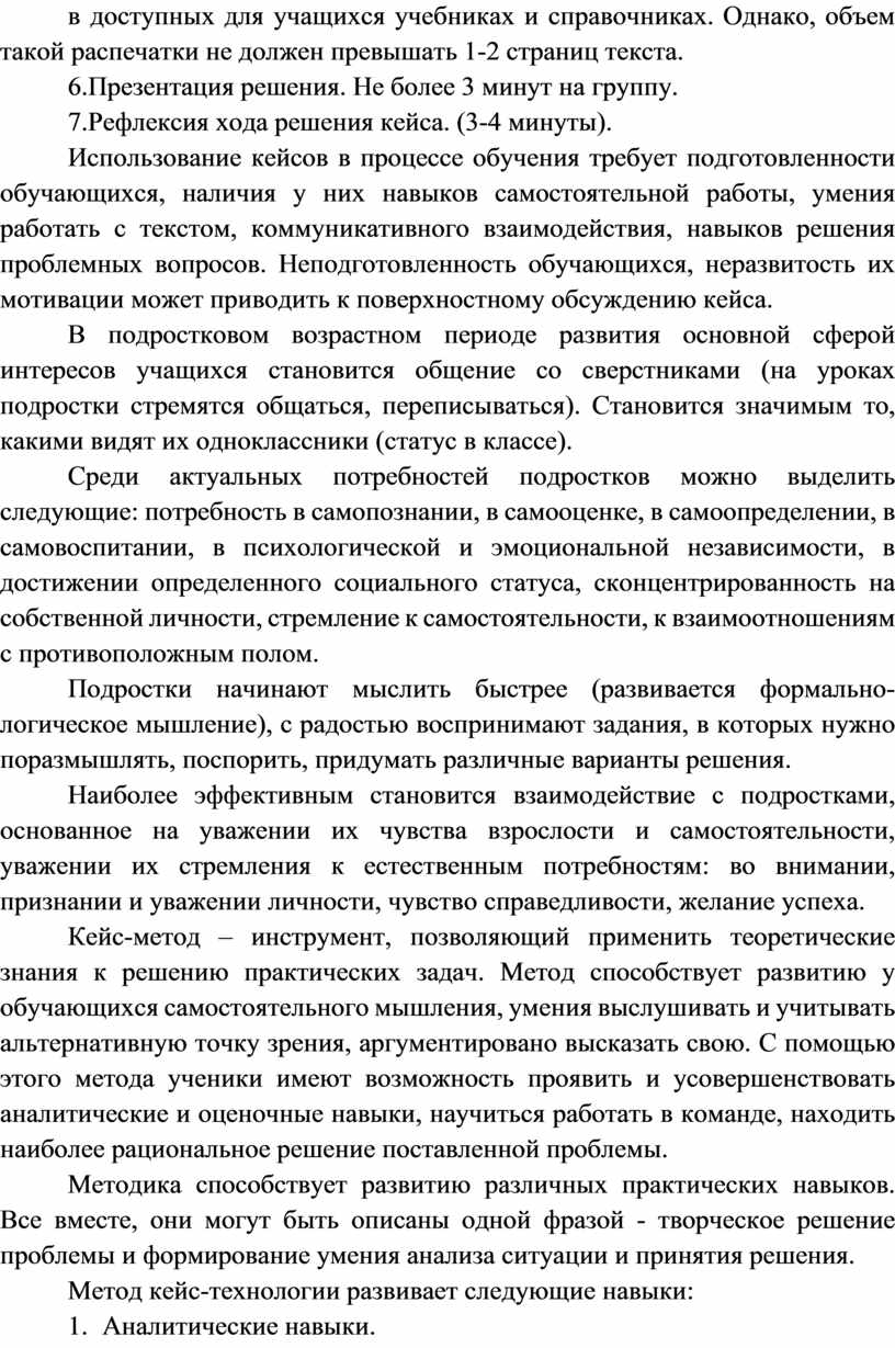 Кейс-метод – инструмент, позволяющий применить теоретические знания к решению практических задач. Метод способствует развитию у обучающихся самостоятельного мышления, умения выслушивать и учитывать альтернативную точку зрения, аргументировано высказать свою. С помощью этого метода ученики имеют возможность проявить и усовершенствовать аналитические и оценочные навыки, научиться работать в команде, находить наиболее рациональное решение поставленной проблемы.