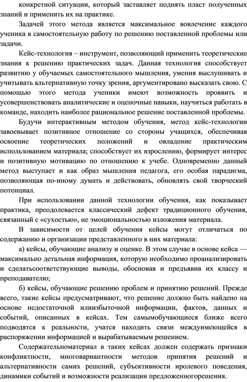 Кейс-технология – это не повторение за учителем, не пересказ параграфа или статьи, не ответ на вопрос преподавателя, это анализ конкретной ситуации, который заставляет поднять пласт полученных знаний и применить их на практике.